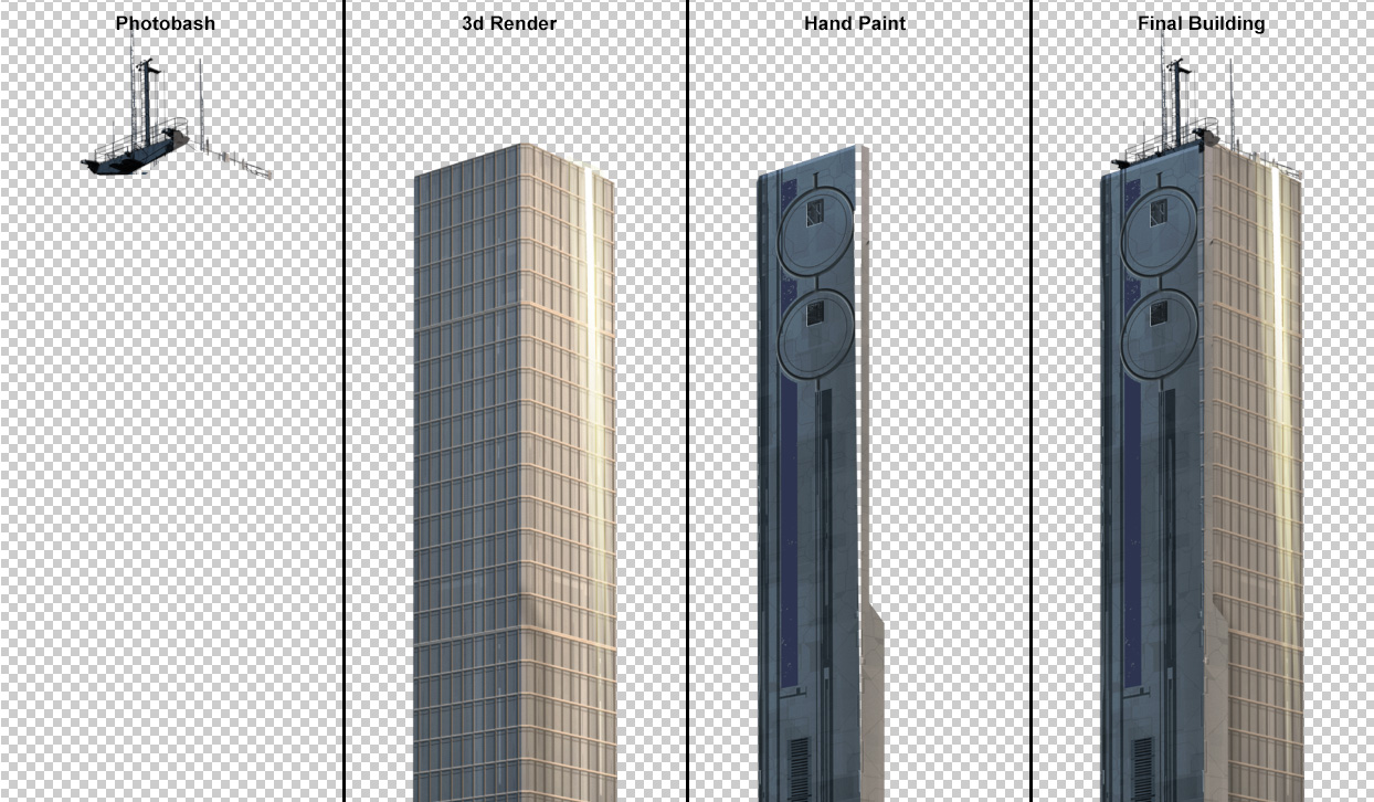 windows. Then I hand painted a portion of the building in Photoshop,