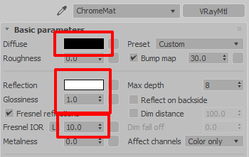 - Color: Almost black Diffuse Color, remember the more specular
